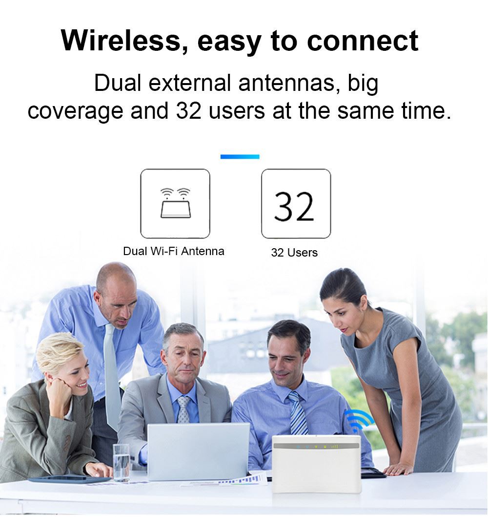 Qhov no yog qhov siab tshaj LTE sab hauv tsev CPE router. Nws yog tsim los ua kom tau raws li cov ntaub ntawv sib xyaw ua ke thiab Wi-Fi kev xav tau rau cov neeg siv vaj tse, kev lag luam thiab kev lag luam. (tuaj yeem txuas rau SMA connector lwm tus kav hlau txais xov !) 150M kev kub ceev, LTE FDD: DL / UL 150M / 50 Mbps (Cat 4). Hloov 4G rau Wi-Fi, Tsis xav tau Broadband nkag, ntxig ib daim npav SIM, ntsaws thiab ua si. WiFi npog tag nrho cov chav tsev thiab lub tsev, txaus siab rau kev kub ceev internet nyob txhua qhov chaw. Ib qho yooj yim mus cuag, dual tus kav hlau txais xov sab nraud, kev pabcuam loj thiab 32 cov neeg siv tib lub sijhawm.