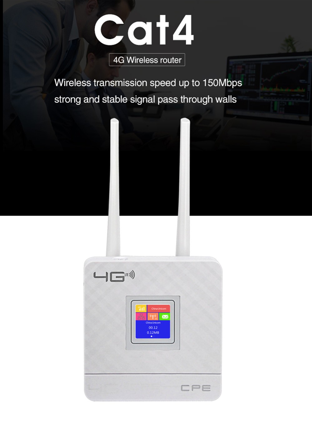 CPE903 yog lub zog siab 4G wireless router nrog 4G sim daim npav qhov thiab MIPS networking processor, nws yog ib qho kev daws teeb meem rau kev lag luam, tsev, tuam txhab, chaw ua haujlwm Wi-Fi networking. Nws tau sib xws nrog IEEE 802.11b / g / n tus qauv, cov ntaub ntawv tus nqi nce mus txog 300Mbps. Nrog dual tus kav hlau txais xov sab nraud, Wi-Fi teeb liab yog qhov ruaj khov thiab ntev dua. Nws txhawb 10 Wi-Fi Cov neeg siv ib txhij.