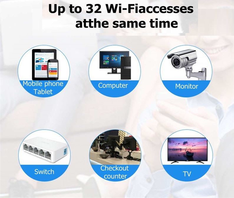 UP to 32 WiFi accesses at the same time. While the 4G router is transmitting WiFi, it can also connect computers, monitors, switches, cash registers, televisions and other equipment with network cables at the same time.